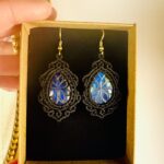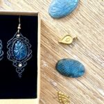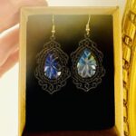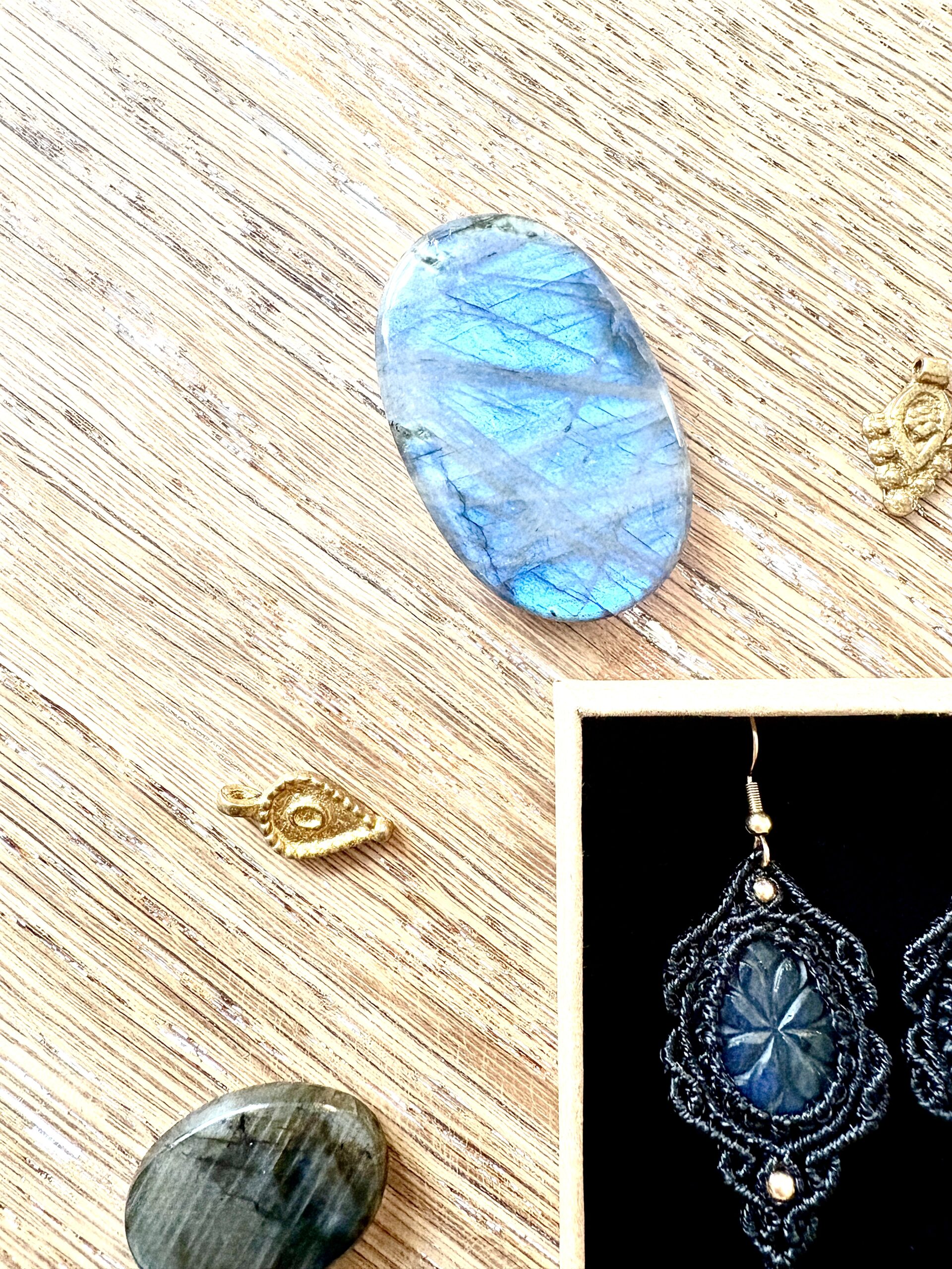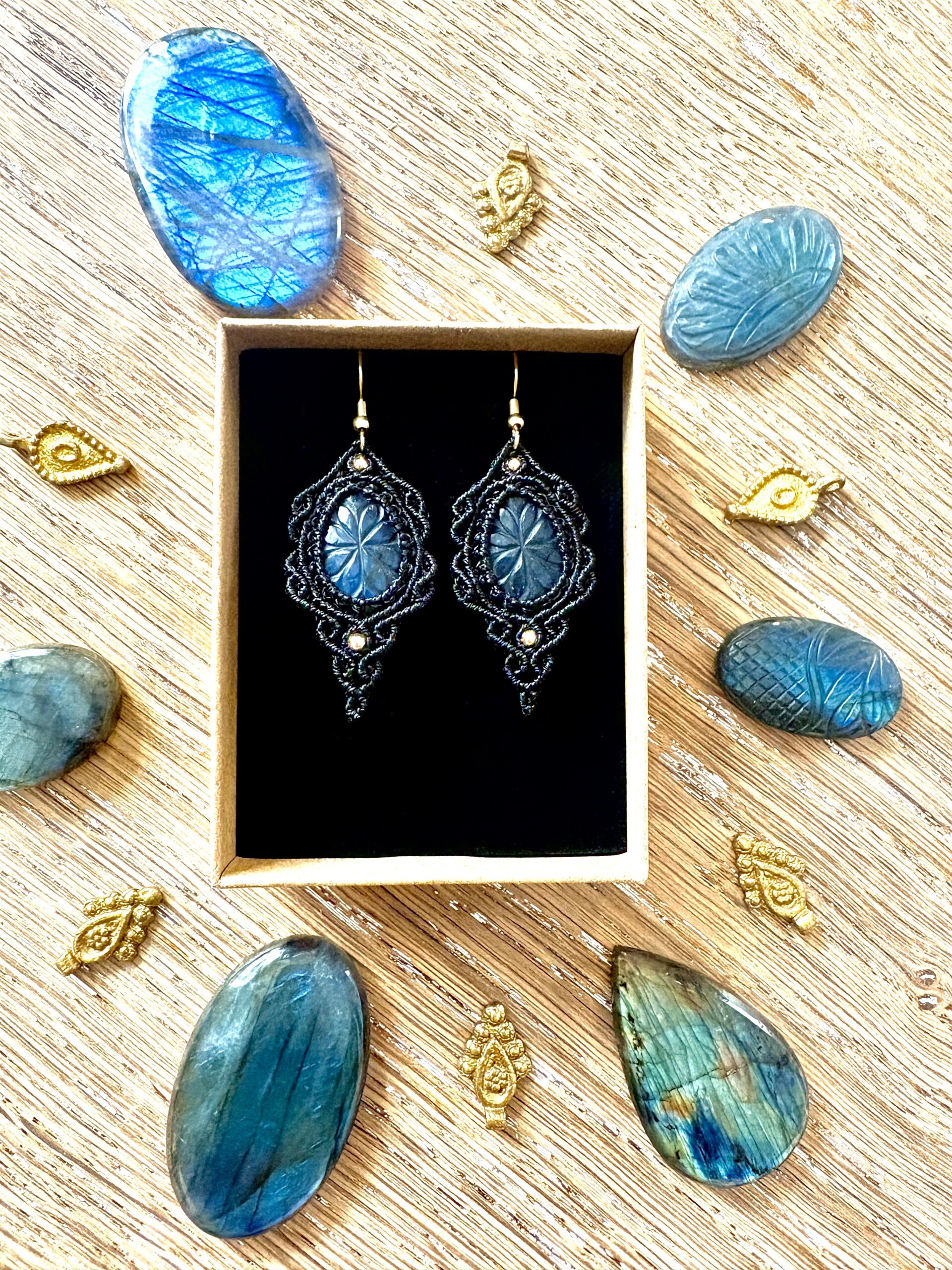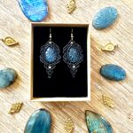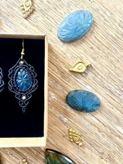 Ornées de somptueuses labradorites ciselées de motifs fleurs, en forme de goutte, ces boucles d’oreilles sont soigneusement réalisées à la main, alliant l’art du micro macramé à la beauté naturelle de la labradorite, connue pour son rôle de bouclier contre les énergies négatives.