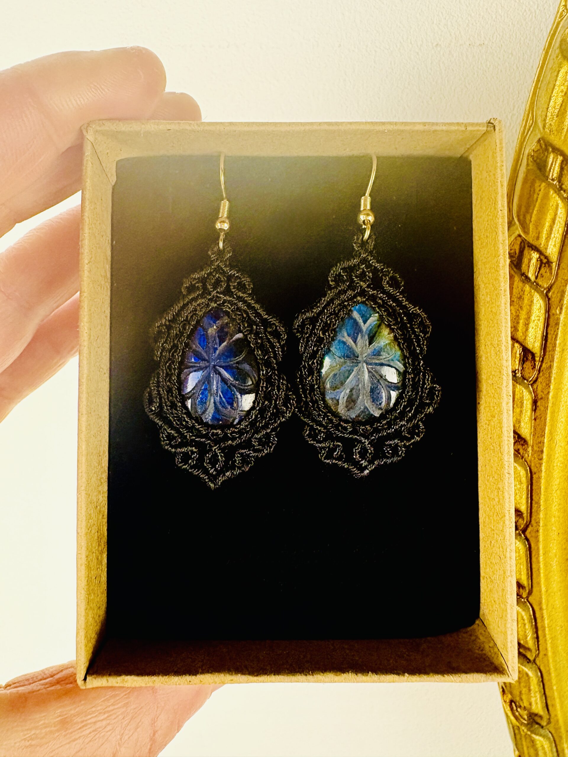 Fil ciré linhasita de couleur noir, labradorites ciselées de fleurs en forme de goutte, attaches en acier inoxydable dorées.