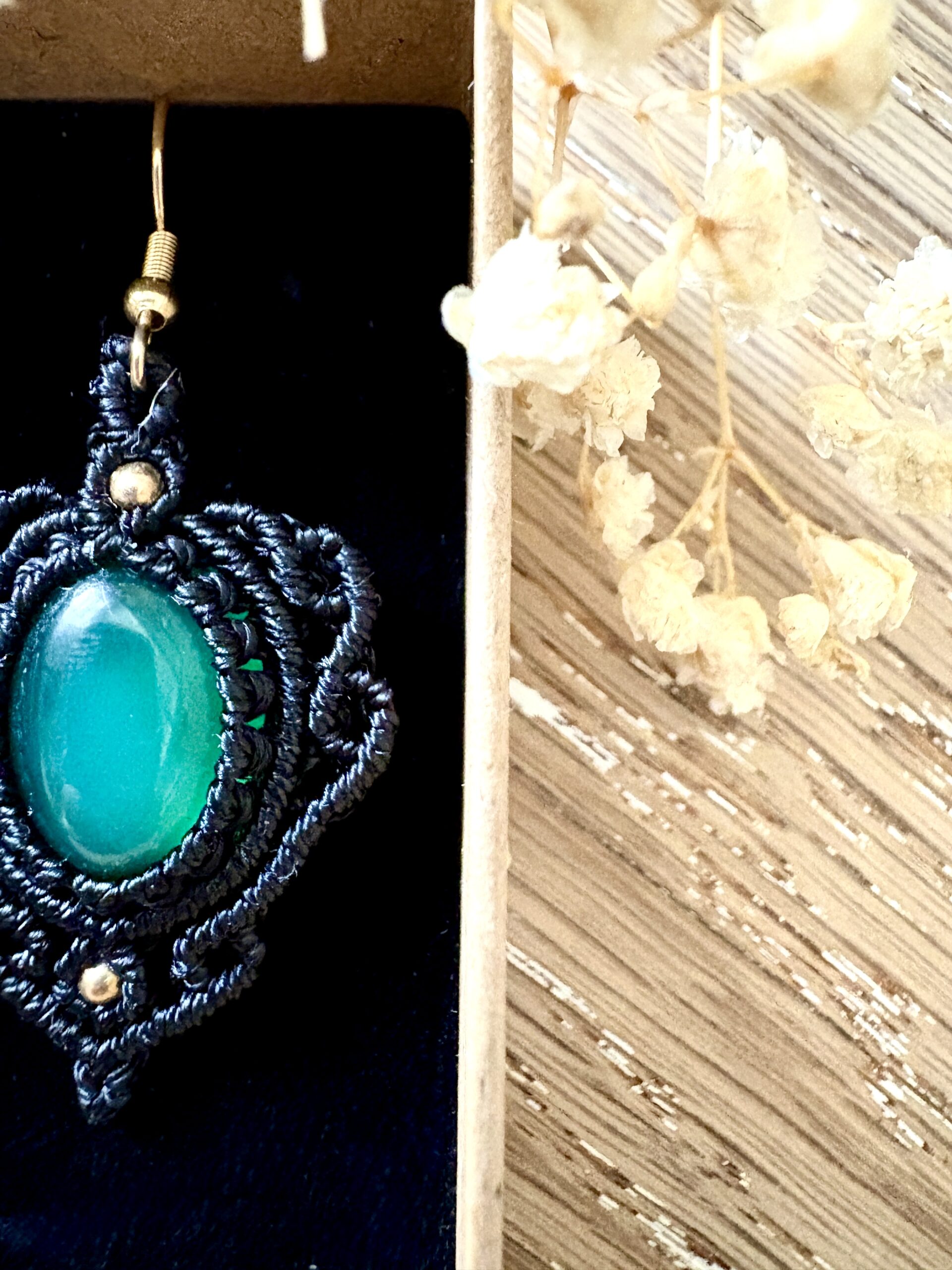 Ornées d’agates vertes. Chaque paire est soigneusement réalisée à la main, alliant l’art du macramé à la beauté naturelle de l’agate verte, connue pour dissiper l’anxiété et favoriser le bien-être.