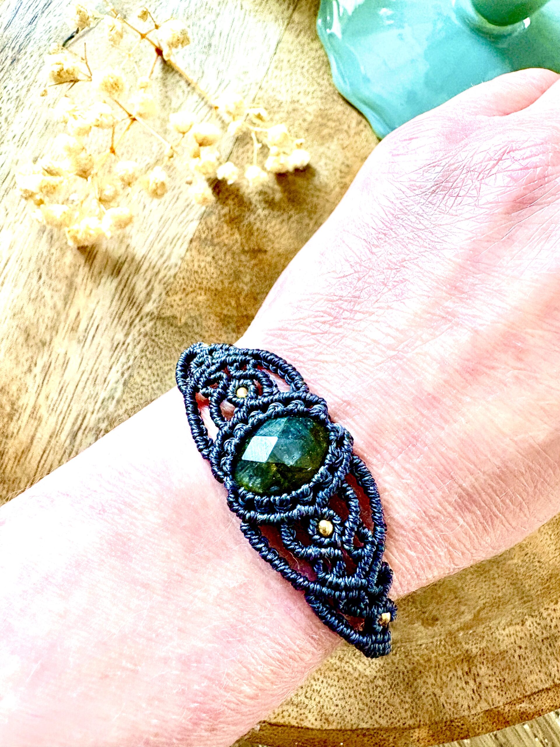 Ornée d’une labradorite facettée. Ce bracelet est soigneusement réalisé à la main, alliant l’art du macramé à la beauté naturelle de la labradorite, connue pour son rôle de bouclier contre les énergies négatives.
