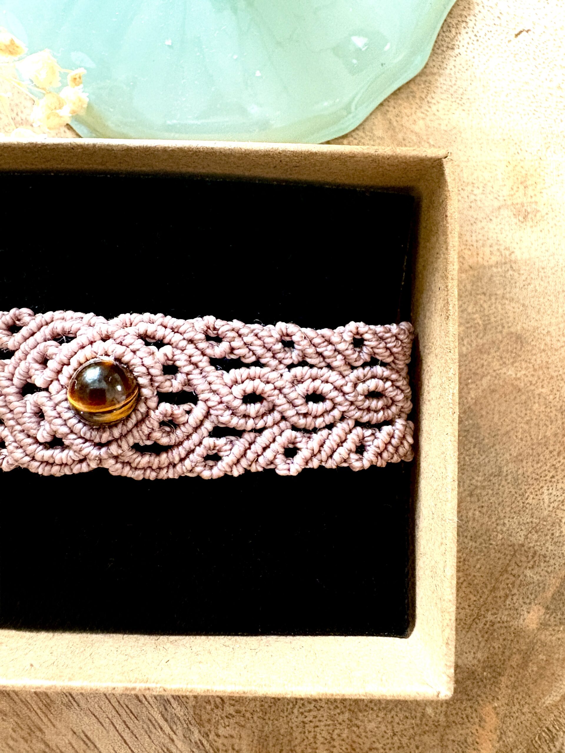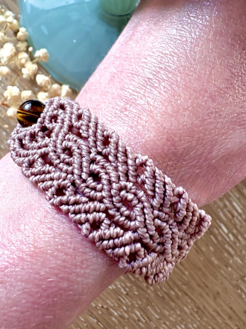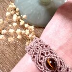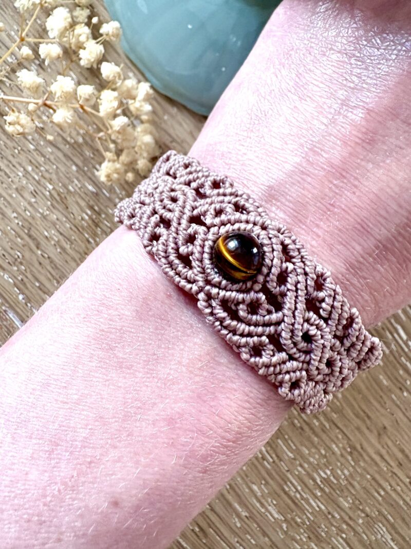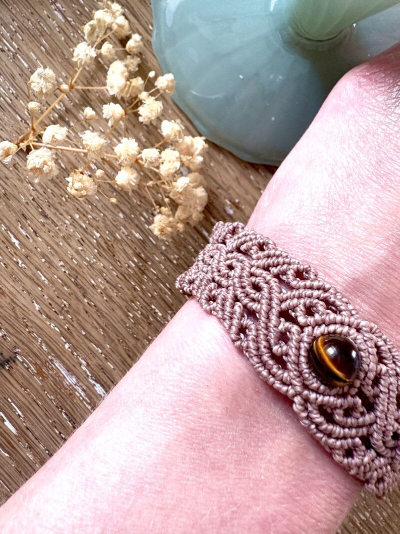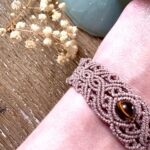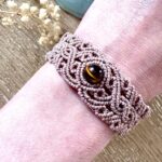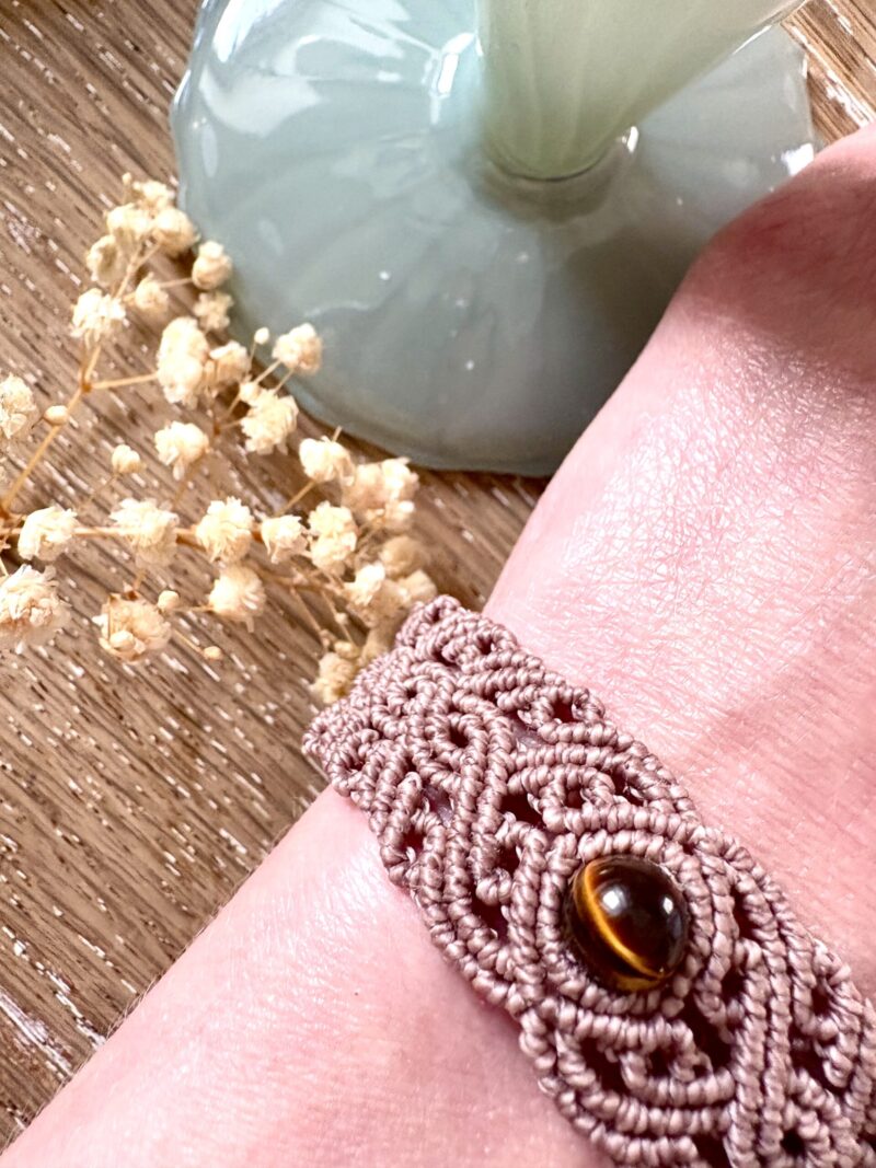 Ornées d’une perle d’oeil de tigre, chaque manchette est soigneusement réalisée à la main, alliant l’art du macramé à la beauté naturelle de l’oeil de tigre, connu pour éloigner les énergies négatives et créer un bouclier contre les influences indésirables. Cette manchette est montée sur une ravissante perle d’oeil de tigre aux reflets dorés, accompagnée d’un délicat design arabesques.