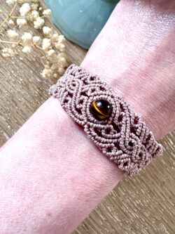 Bracelet macramé marron glacé avec perle œil de tigre, design arabesques. Bijou fait main, favorisant confiance et concentration.