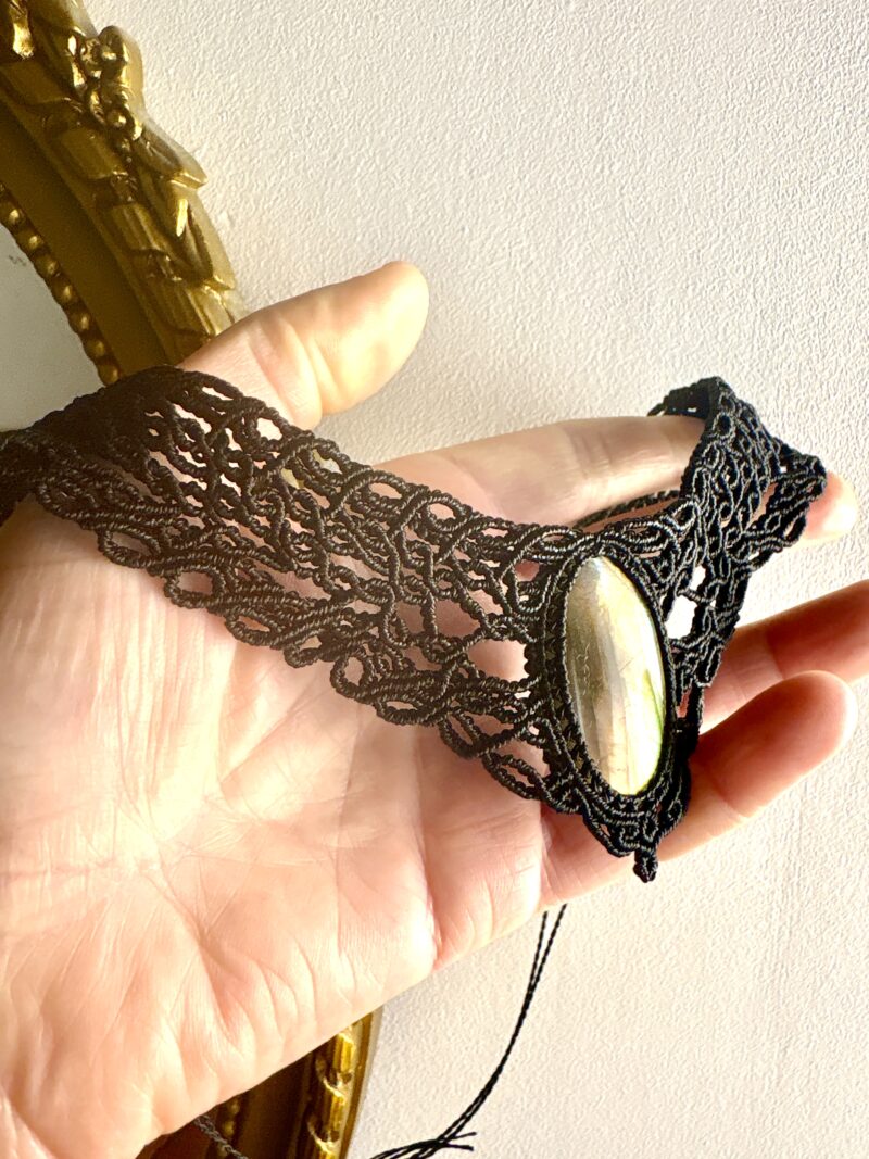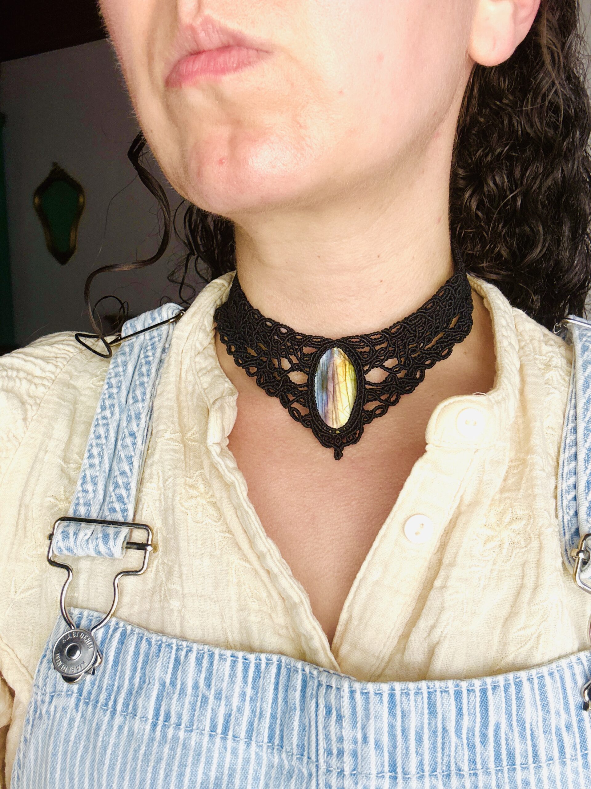 Ornée d’une somptueuse labradorite , ce chocker est soigneusement réalisé à la main, alliant l’art du micro macramé à la beauté naturelle de la labradorite, connue pour son rôle de bouclier contre les énergies négatives.