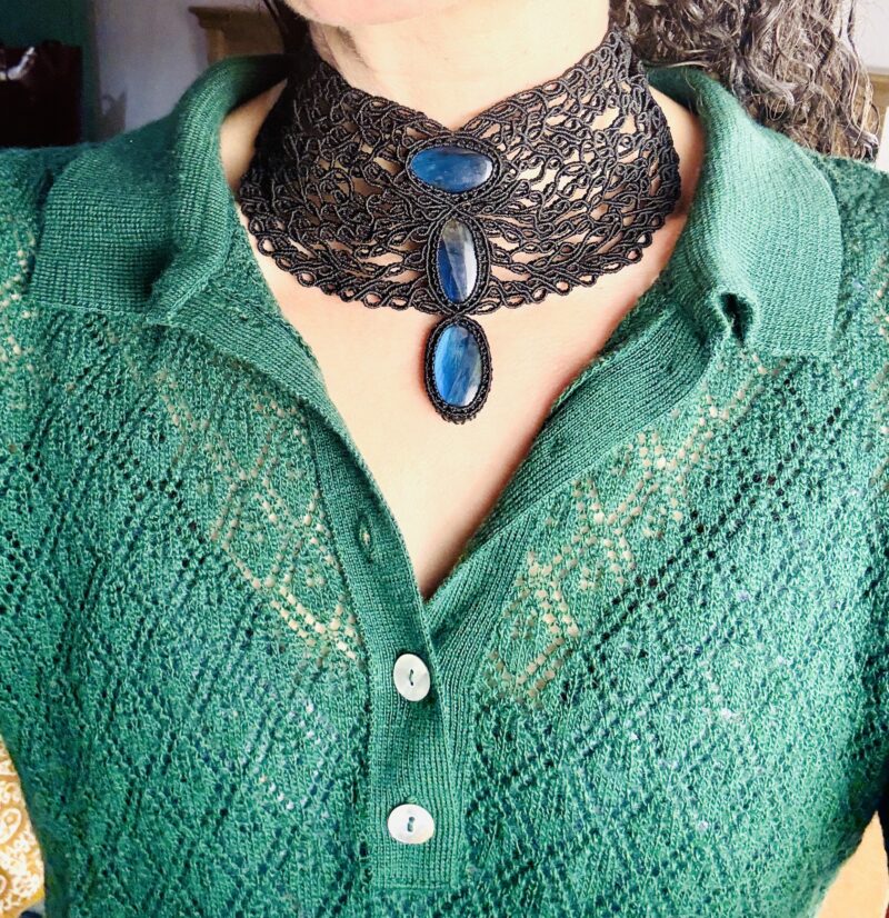 Ornée de 3 somptueuses labradorites , ce plastron est soigneusement réalisé à la main, alliant l’art du micro macramé à la beauté naturelle de la labradorite, connue pour son rôle de bouclier contre les énergies négatives.