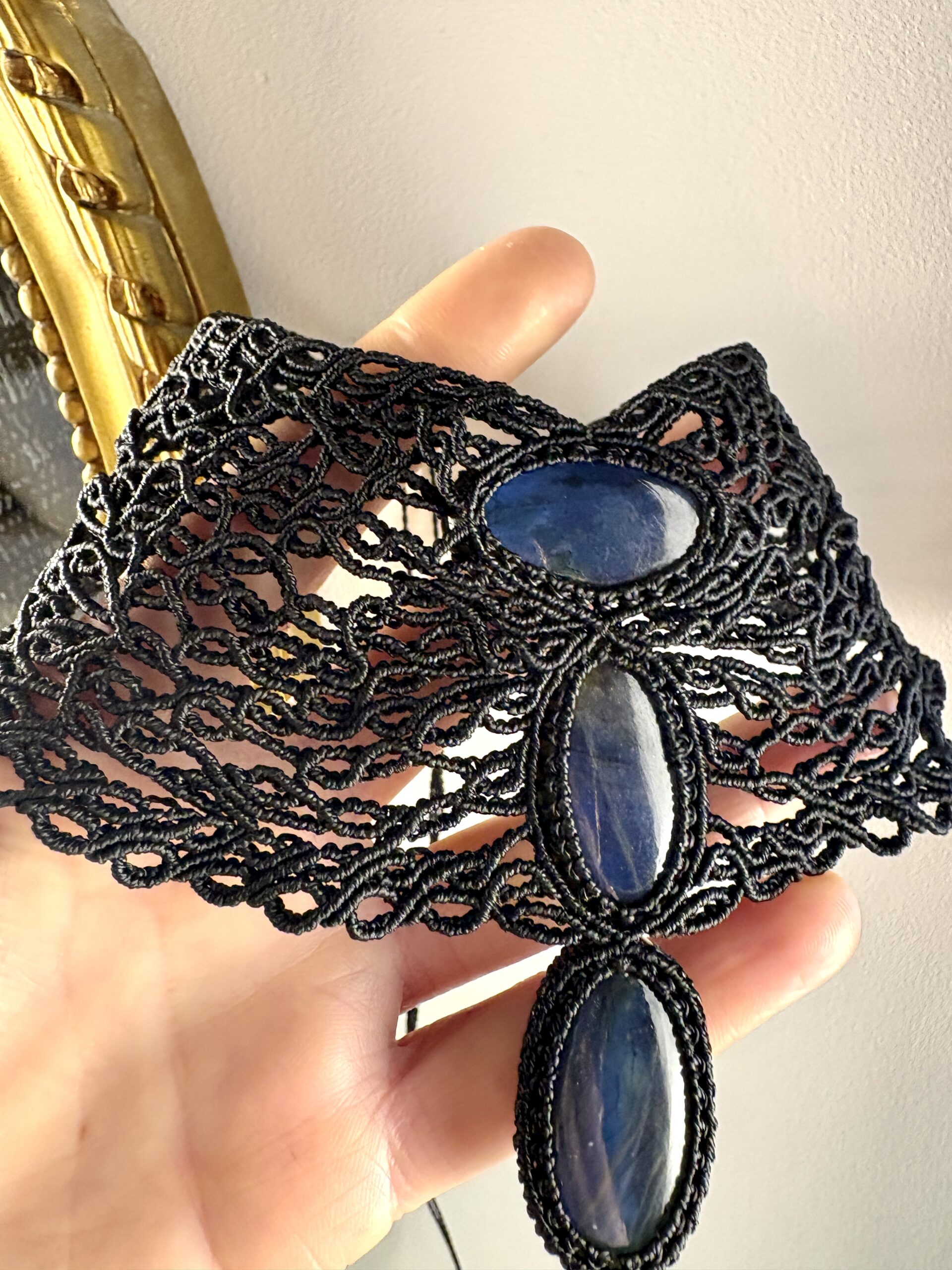 Ornée de 3 somptueuses labradorites , ce plastron est soigneusement réalisé à la main, alliant l’art du micro macramé à la beauté naturelle de la labradorite, connue pour son rôle de bouclier contre les énergies négatives.