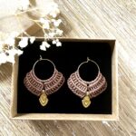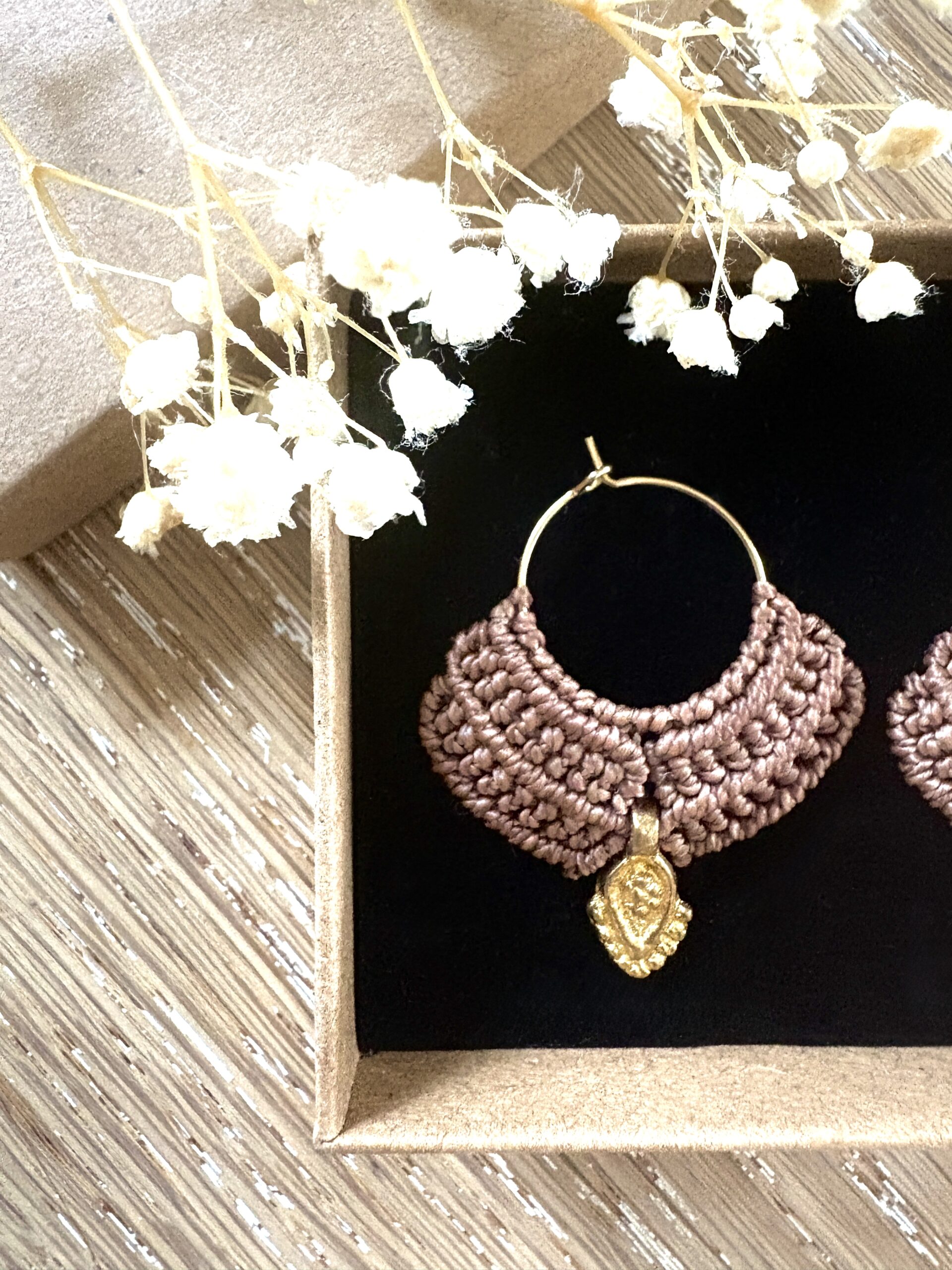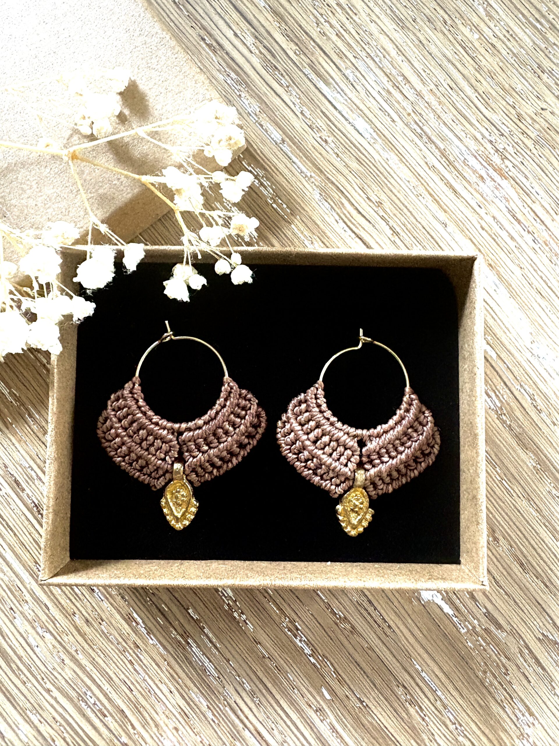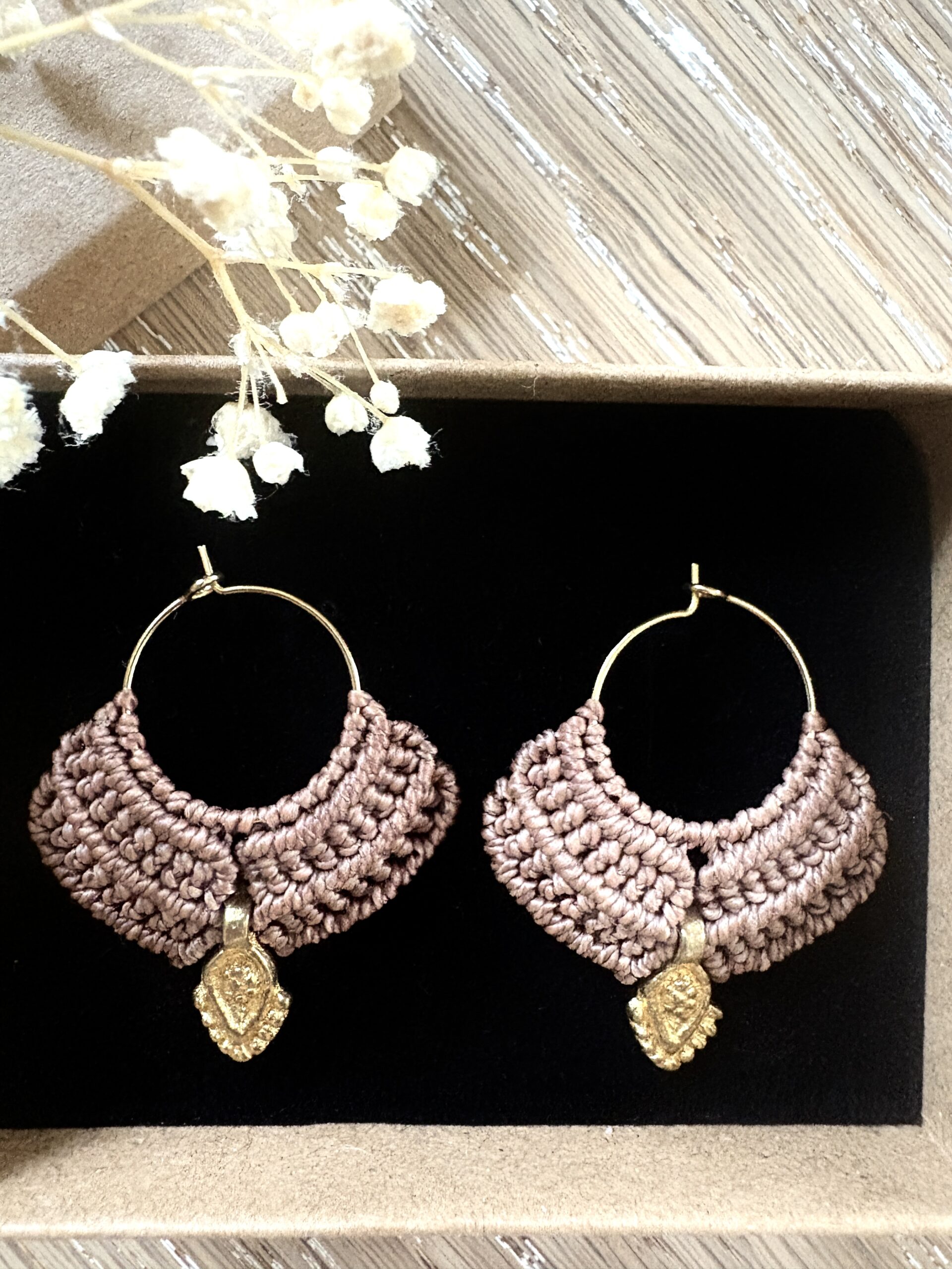 Apportez une touche de raffinement et de modernité à votre style avec ces boucles d’oreilles en micro macramé délicatement tissées à la main, sublimées par de magnifiques breloques indiennes en laiton.