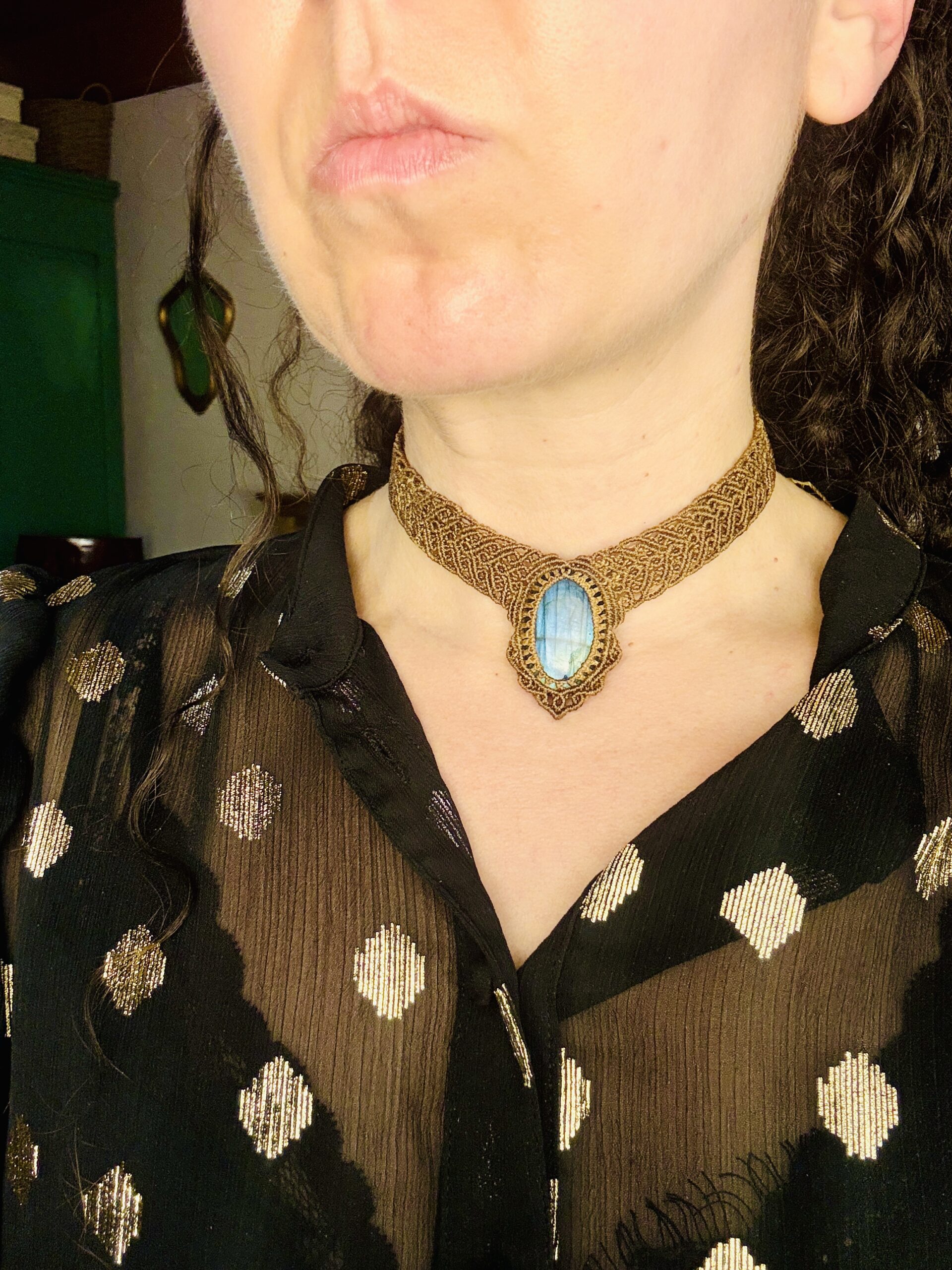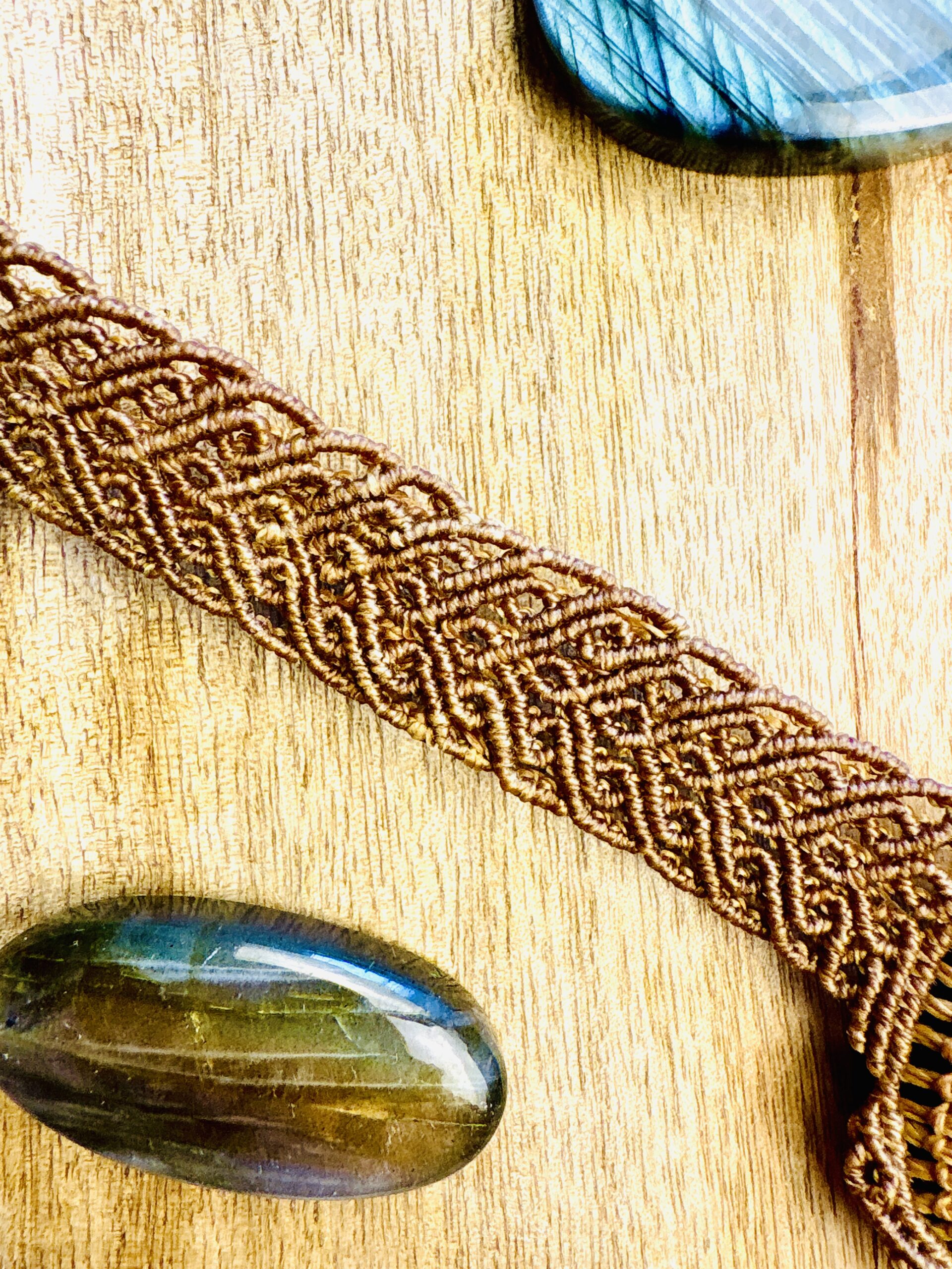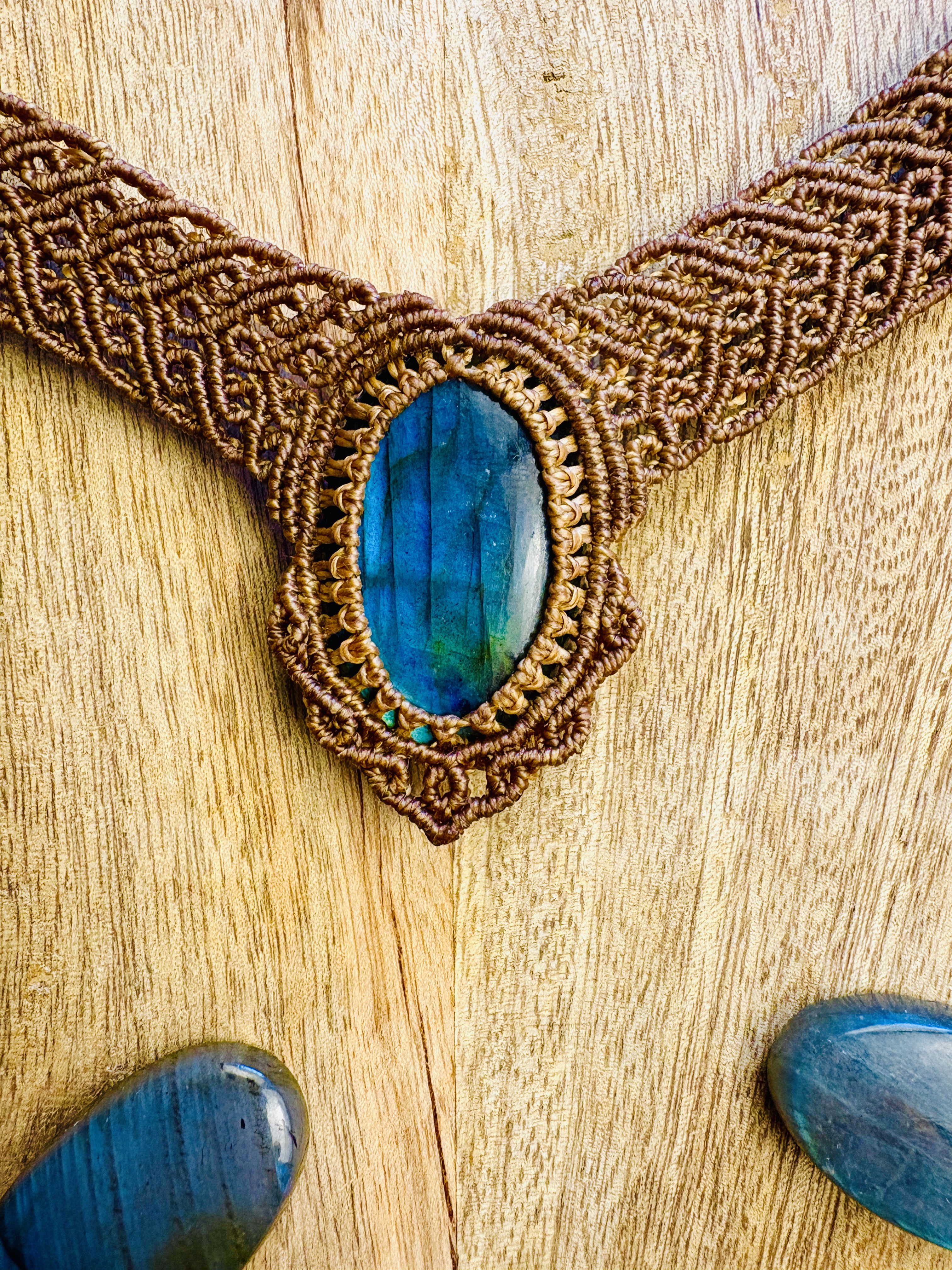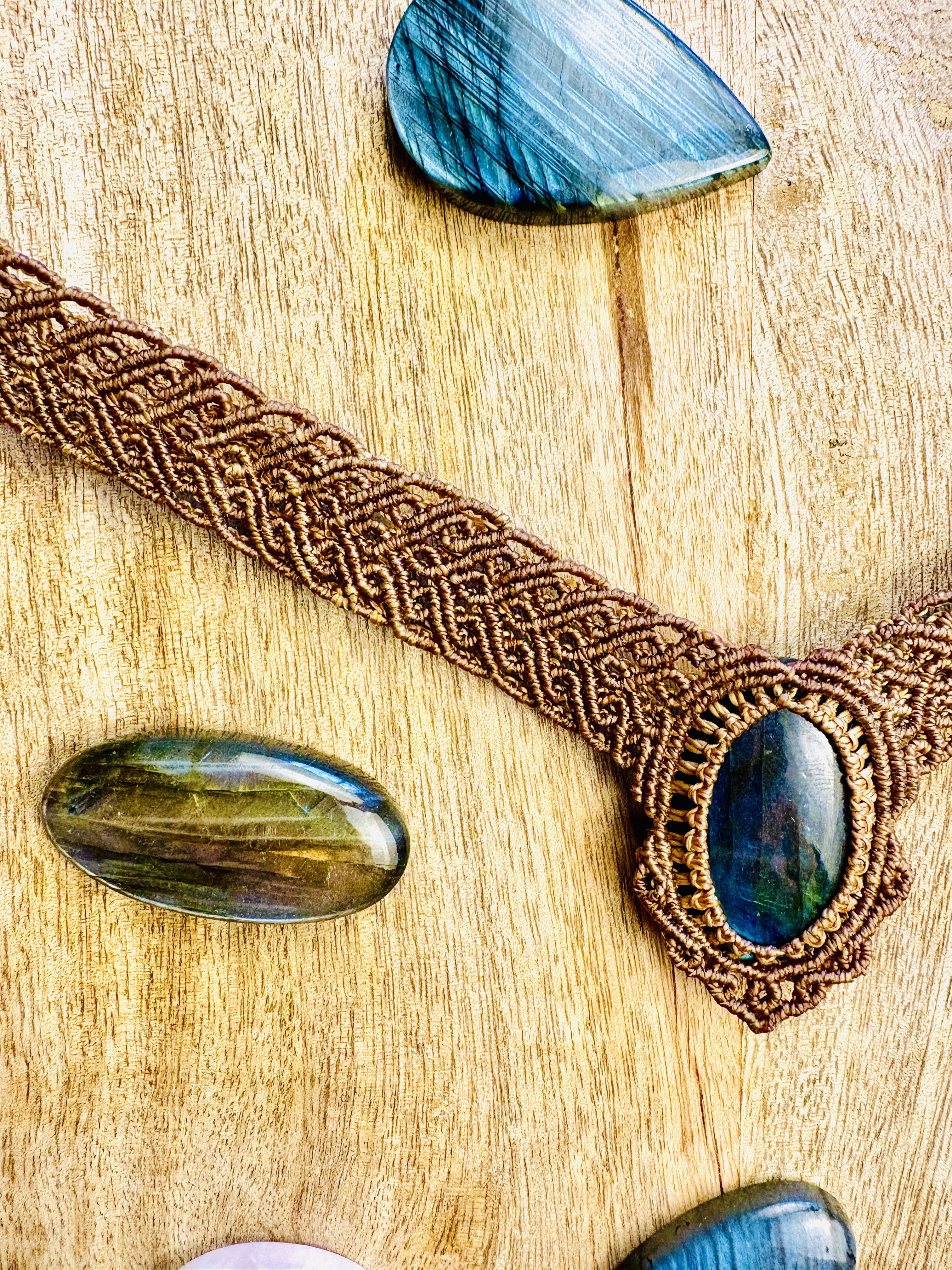 Ornée d’une somptueuse labradorite , ce diadème est soigneusement réalisé à la main, alliant l’art du micro macramé à la beauté naturelle de la labradorite, connue pour son rôle de bouclier contre les énergies négatives.