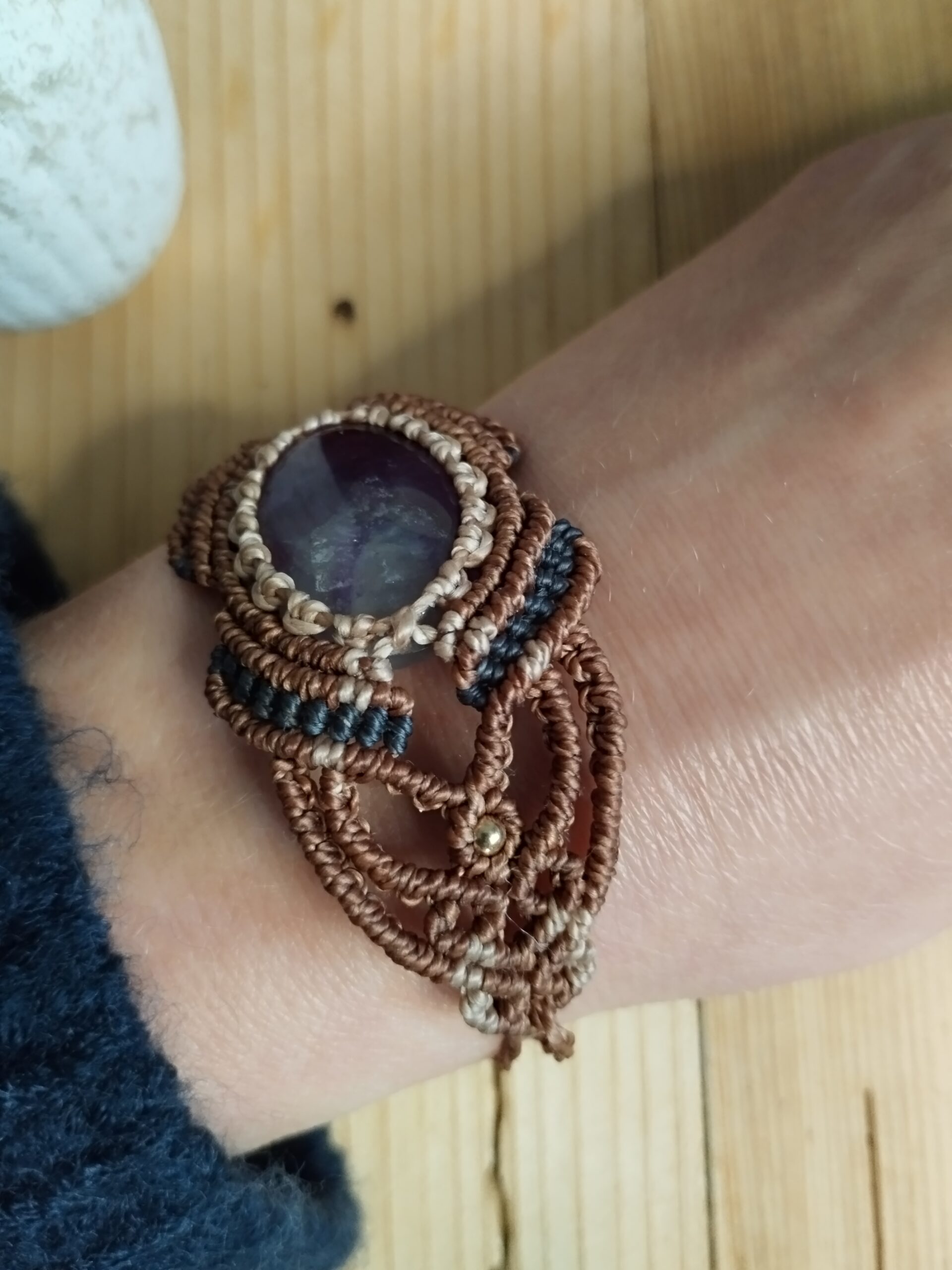 Ornée d’une somptueuse améthyste. Cette manchette est soigneusement réalisé à la main, alliant l’art du macramé à la beauté naturelle de l’améthyste, connue pour apaiser les angoisses et les colères.