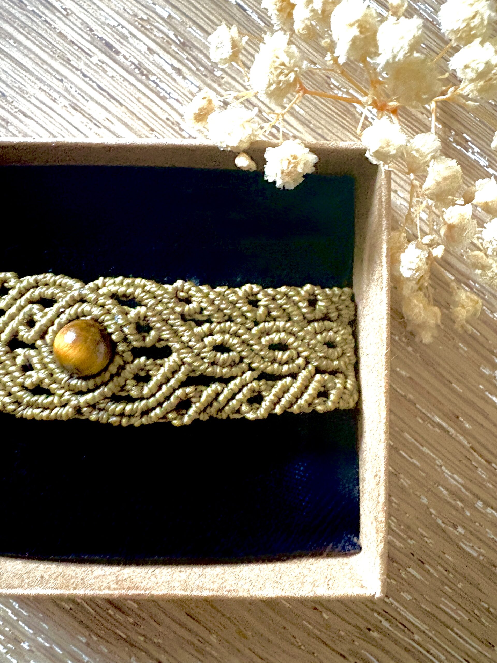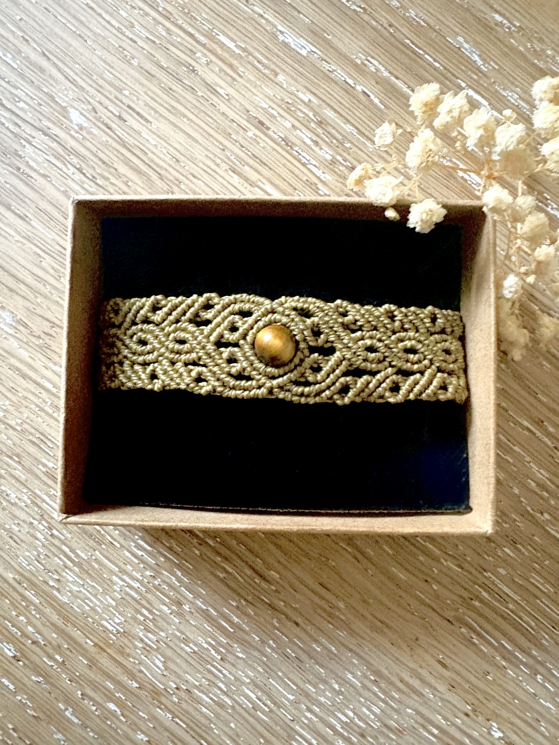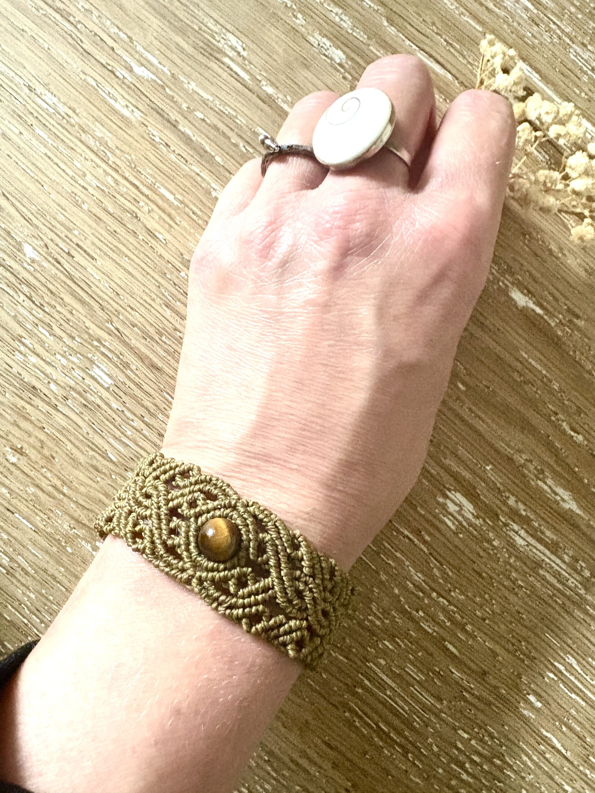 Ornée d’une perle d’oeil de tigre, chaque manchette est soigneusement réalisée à la main, alliant l’art du macramé à la beauté naturelle de l’oeil de tigre, connu pour éloigner les énergies négatives et créer un bouclier contre les influences indésirables. Cette manchette est montée sur une ravissante perle d’oeil de tigre aux reflets dorés, accompagnée d’un délicat design arabesques.