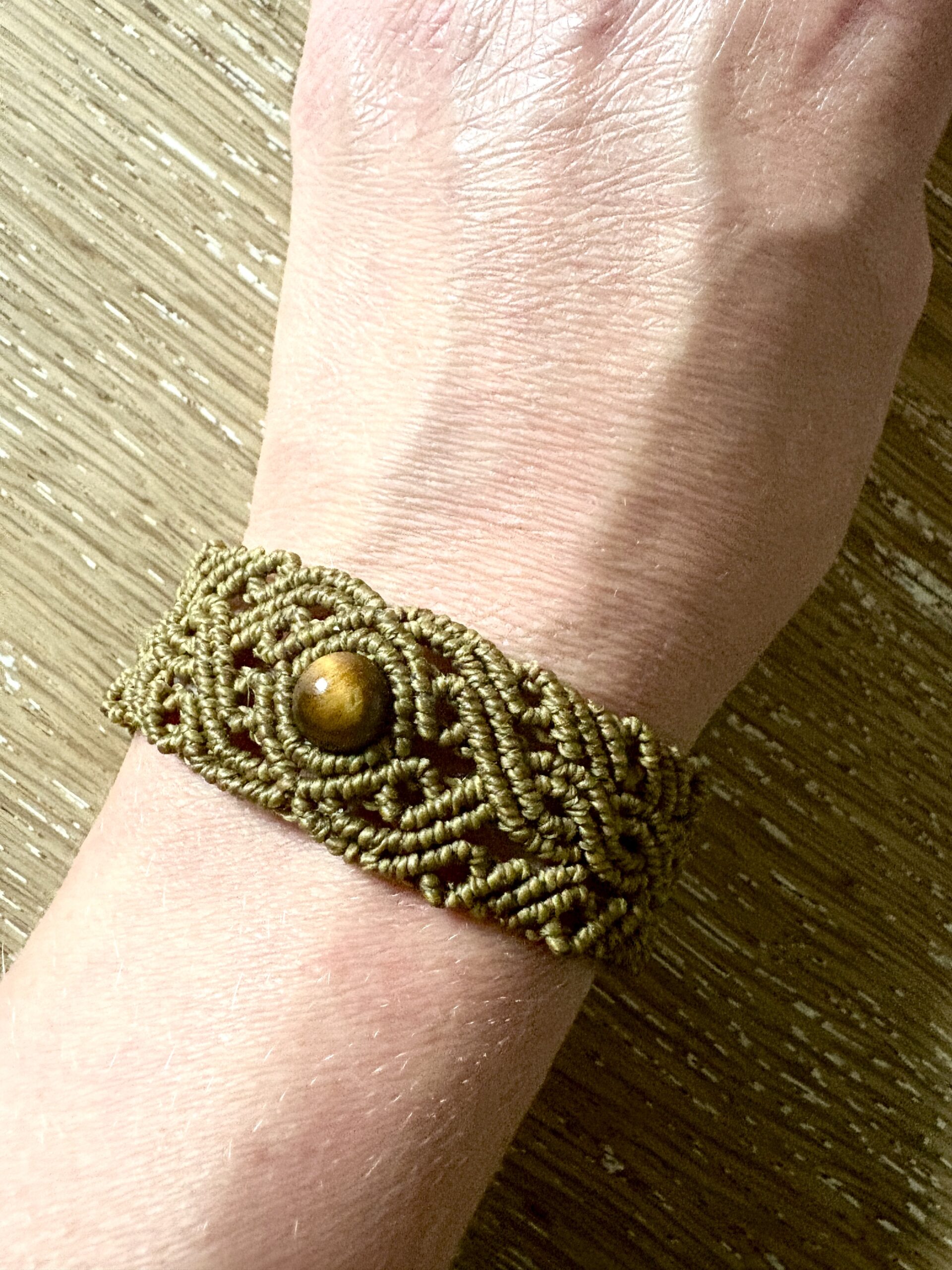 Fil ciré linhasita de couleur kaki, perle d’oeil de tigre.