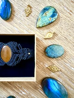 Orné d’un cabochon d’oeil de tigre, chaque manchette est soigneusement réalisée à la main, alliant l’art du macramé à la beauté naturelle de l’oeil de tigre, connu pour éloigner les énergies négatives et créer un bouclier contre les influences indésirables. Cette manchette est montée sur un ravissant cabochon d’oeil de tigre aux reflets dorés, accompagné d’un délicat design arabesques.