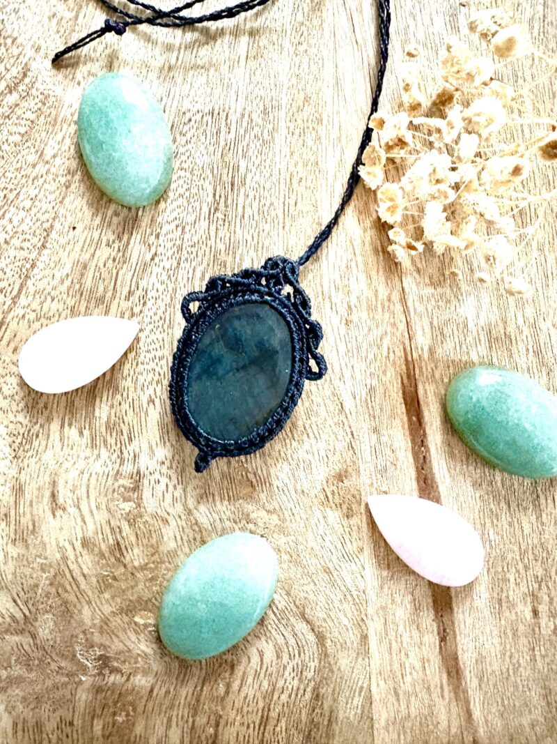 Ornée d’une somptueuse labradorite, ce talisman est soigneusement réalisé à la main, alliant l’art du macramé à la beauté naturelle de la labradorite, connue pour son rôle de bouclier contre les énergies négatives.