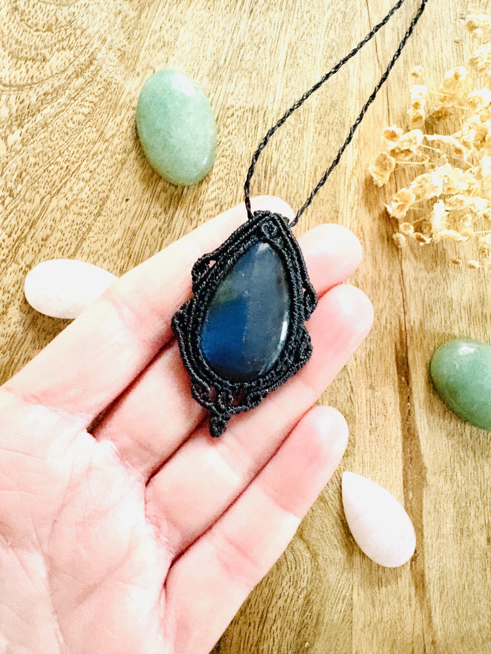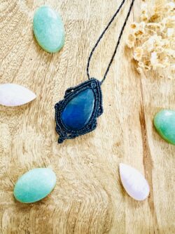 Ornée d’une somptueuse labradorite, ce médaillon est soigneusement réalisé à la main, alliant l’art du macramé à la beauté naturelle de la labradorite, connue pour son rôle de bouclier contre les énergies négatives.