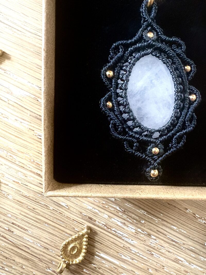 Orné d’un magnifique quartz rose, chaque médaillon est soigneusement réalisé à la main, alliant l’art du macramé à la beauté naturelle du quartz rose, connue pour rééquilibrer les énergies du corps afin d’apaiser l’esprit et favoriser le bien-être.