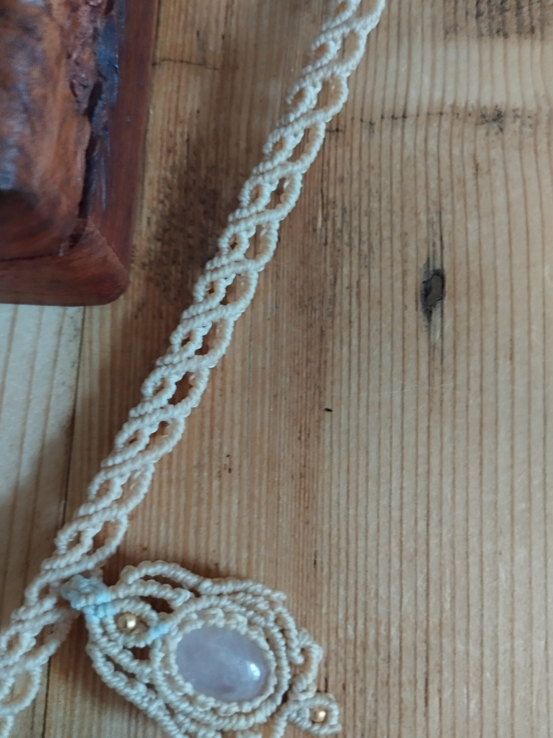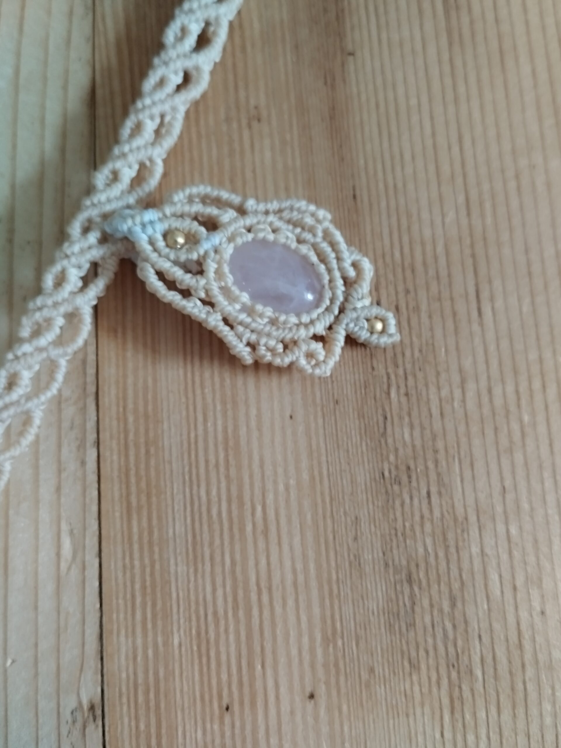 Ornée d’un somptueux quartz rose. Ce bijou est soigneusement réalisé à la main, alliant l’art du macramé à la beauté naturelle du quartz rose, connue pour ses propriétés calmantes et apaisantes.