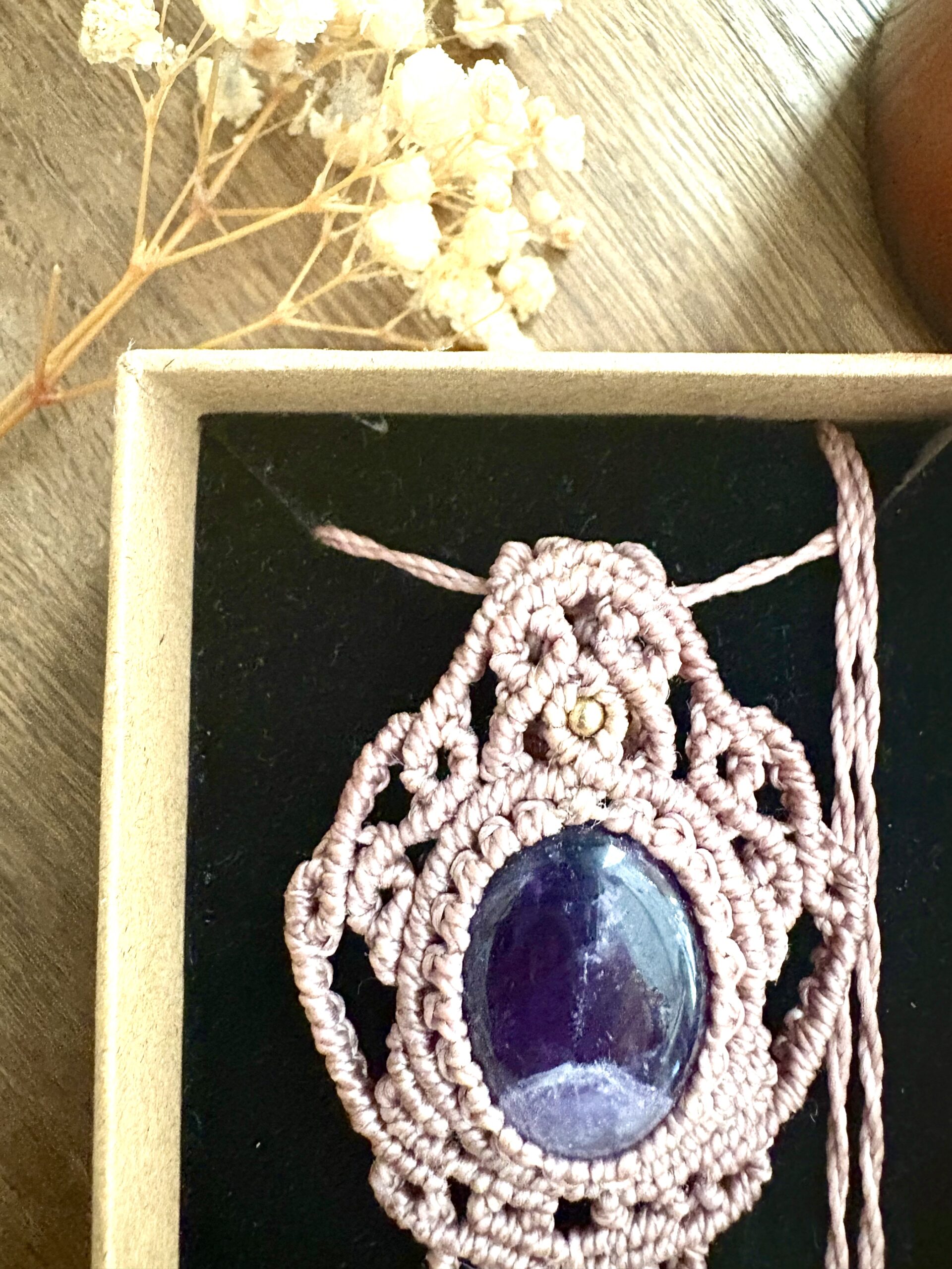 Talisman en macramé taupe avec améthyste, bijou artisanal unique aux vertus apaisantes. Élégant et intemporel, parfait pour offrir ou se faire plaisir.