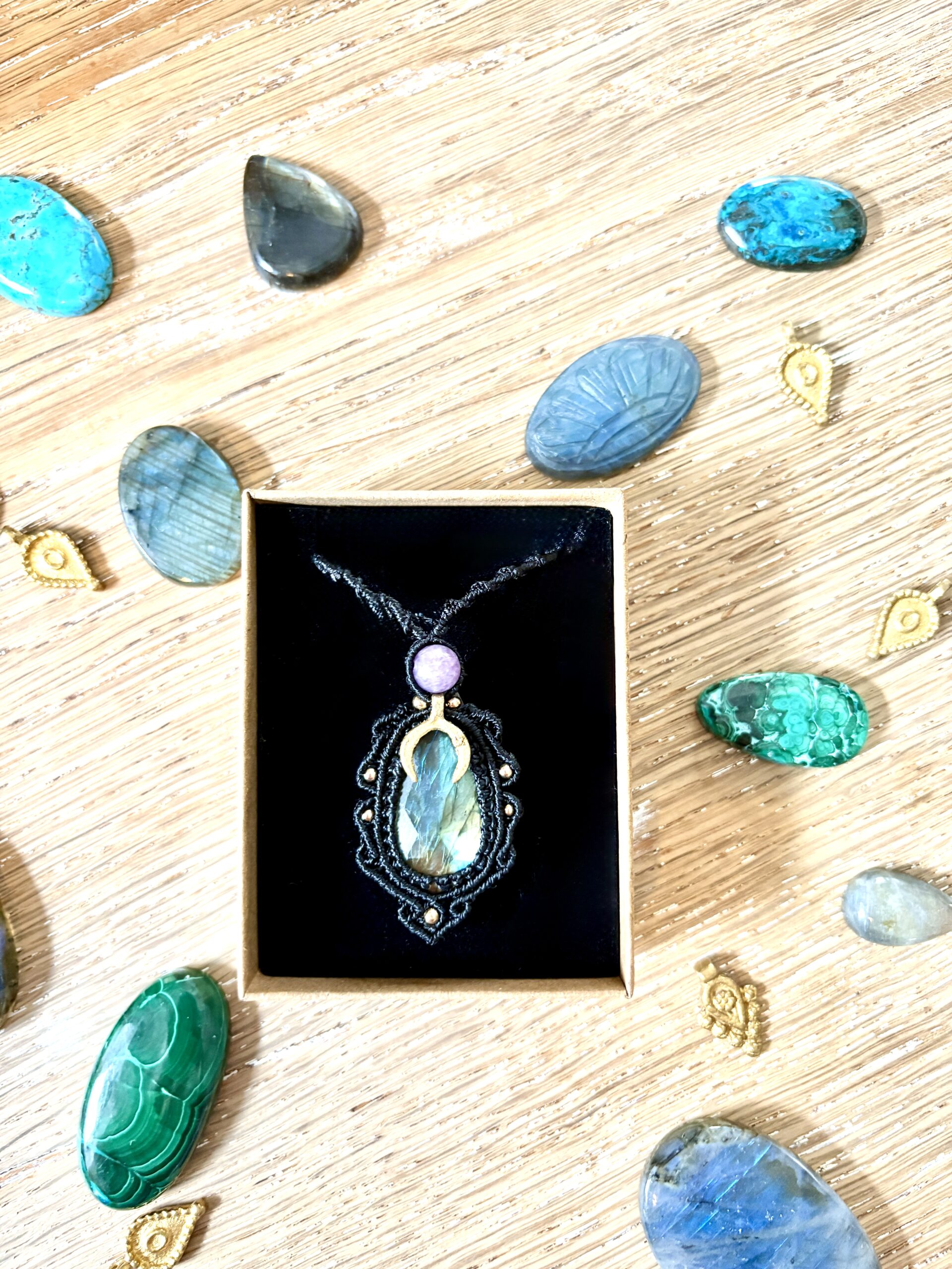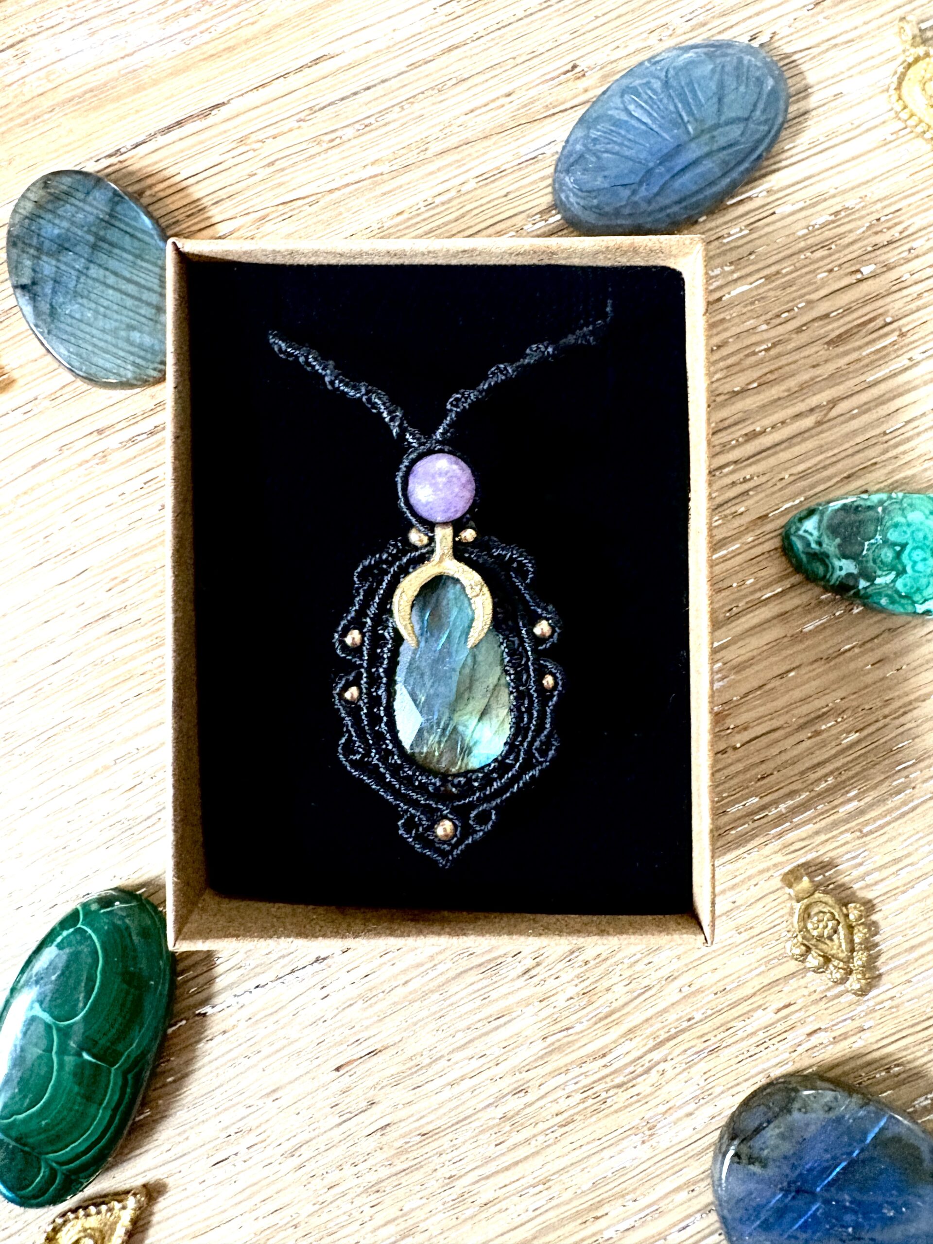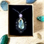 Ornée d’une somptueuse labradorite facettée, ce talisman est soigneusement réalisé à la main, alliant l’art du macramé à la beauté naturelle de la labradorite, connue pour son rôle de bouclier contre les énergies négatives.Il se compose d’une labradorite facettée et d’une perle de lépidolite.