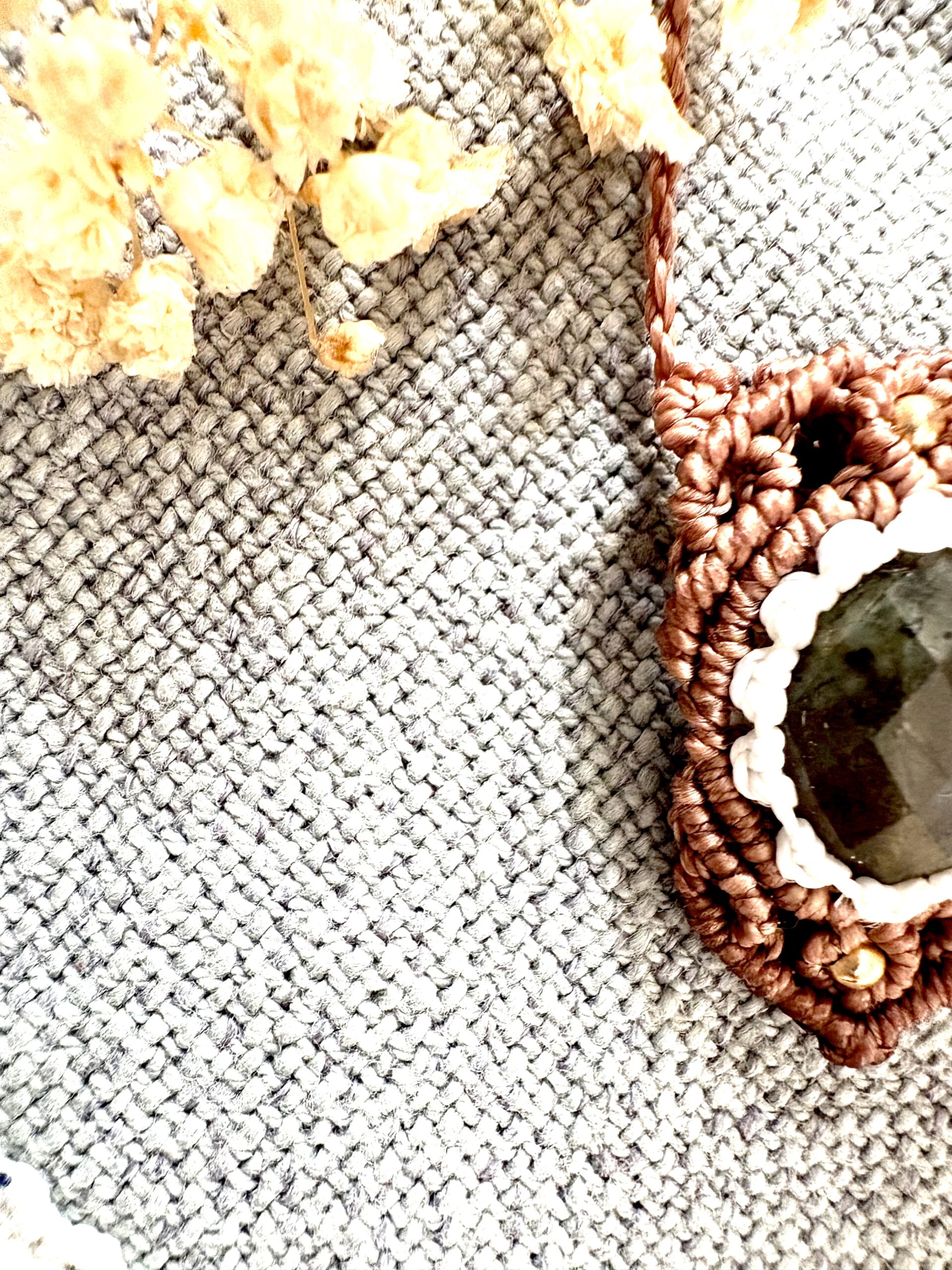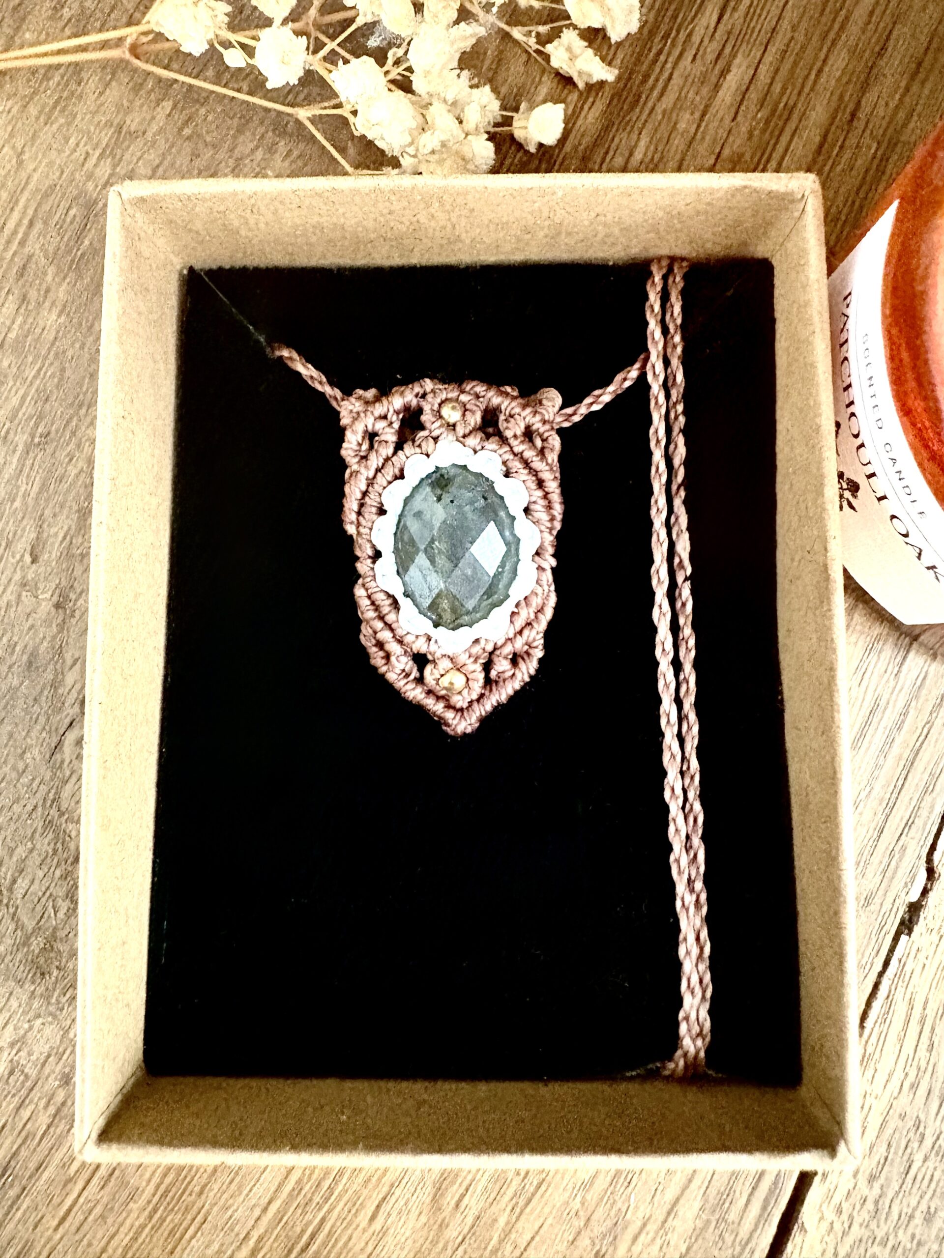 Ornée d’une somptueuse labradorite facettée. Ce pendentif est soigneusement réalisé à la main, alliant l’art du macramé à la beauté naturelle de la labradorite, connue pour son rôle de bouclier contre les énergies négatives.