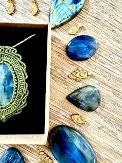Ornée d’une somptueuse labradorite facettée, ce talisman est soigneusement réalisé à la main, alliant l’art du macramé à la beauté naturelle de la labradorite, connue pour son rôle de bouclier contre les énergies négatives.