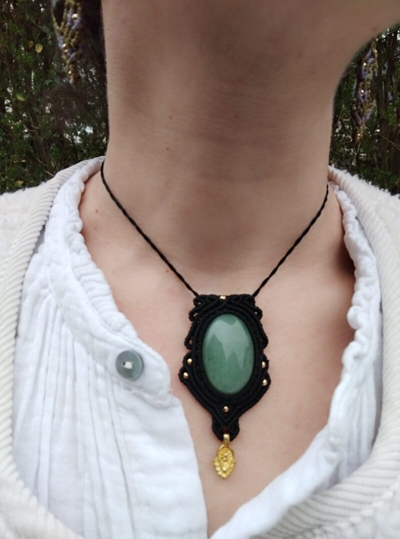 Ornée d’une somptueuse aventurine verte. Ce talisman est soigneusement réalisé à la main, alliant l’art du macramé à la beauté naturelle de l’aventurine verte, connue pour ses vertus apaisantes et équilibrantes.